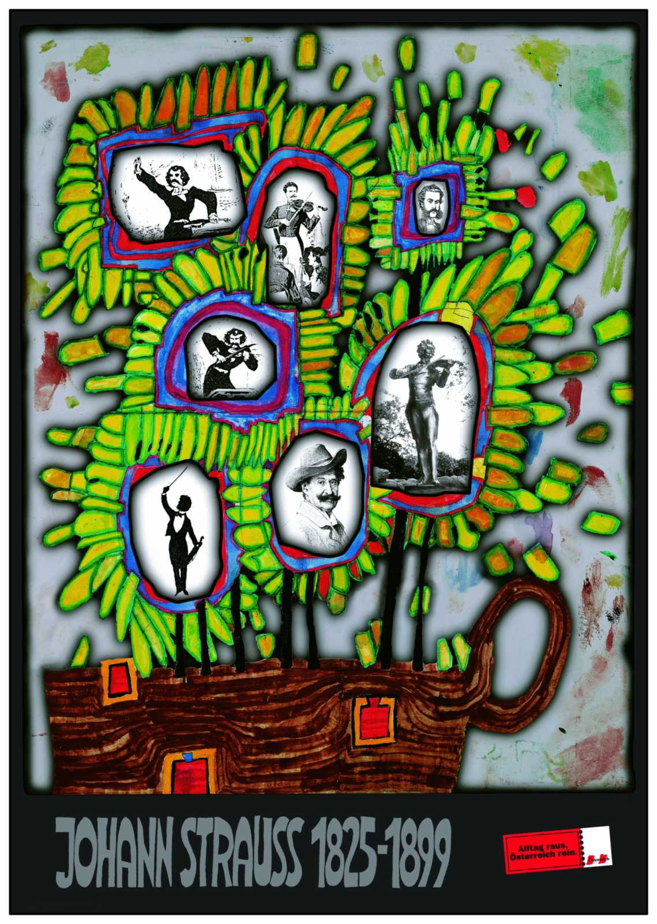 Entwurf für ein Poster für die Österreich Werbung anlässlich des 100. Todestages von Johann Strauß im Jahr 1999. Veröffentlicht von der Österreich Werbung in 8 Sprachversionen.