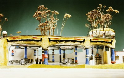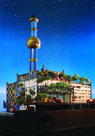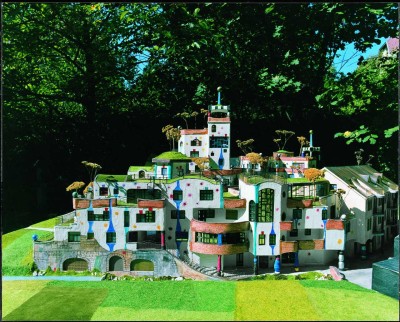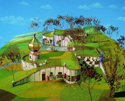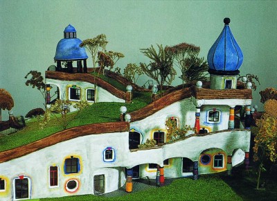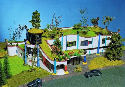 In den 1970er-Jahren ließ Hundertwasser erste Architekturmodelle anfertigen und veranschaulichte seine Ideen der Dachbewaldung, der Baummieter und des Fensterrechts in der TV-Eurovisions-Sendung „Wünsch Dir was“, 1972. Er entwickelte dabei neue architektonische Formen, wie etwa das Spiralhaus, das Augenschlitzhaus, das Terrassenhaus und das Hochwiesenhaus. 1974 kamen das Grubenhaus, das Grasdach-Haus und die begrünte Tankstelle dazu, aber auch sein Konzept der grünen, unsichtbaren und unhörbaren Autobahn.