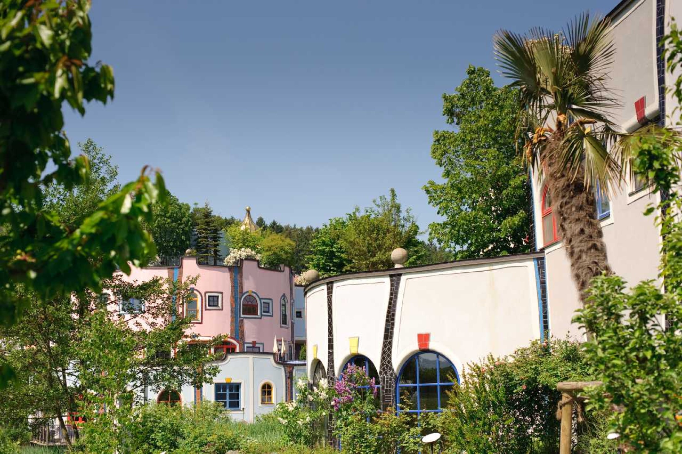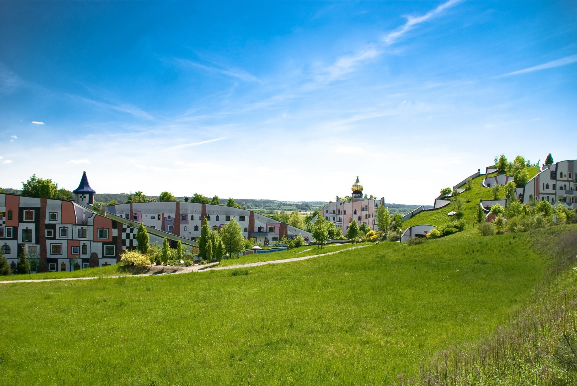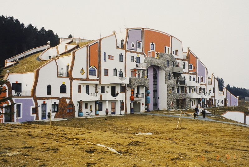 Hundertwasser übernahm auf Einladung von Baumeister Robert Rogner die Planung einer Hotel- und Thermenanlage und entwarf sie als zukunftsweisende Architekturlandschaft im Einklang mit der Natur. Total begrünte, bewandelbare und begehbare Häuser wie das Augenschlitzhaus, das Waldhofhaus und Hügelwiesenhäuser-Rehrückenhäuser wurden erstmals verwirklicht.