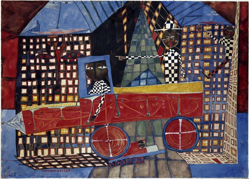 The painting is from 1952. I painted it near Assisi on the way to Arezzo. At the time I was going through a very happy period. I was quite poor. I think one can also see that it is a very happy painting. I hadn't seen the painting for many years. I sold it at the exhibition in Venice in the Sandri Gallery - I think for 5000 lire - and didn't see it again for ten years. Now it has suddenly surfaced in Mexico, and I am very surprised to see this painting again. I can't imagine that I painted it myself. I see for example that there are faces everywhere in the houses and that the driver is even pushing a nose to the side here at the car door. I was sent a transparency of this painting from Mexico. The cut was made from the transparency. (from: Hundertwasser, Buchheim Verlag, Feldafing, 1964 and ed. 1973, p. 30)