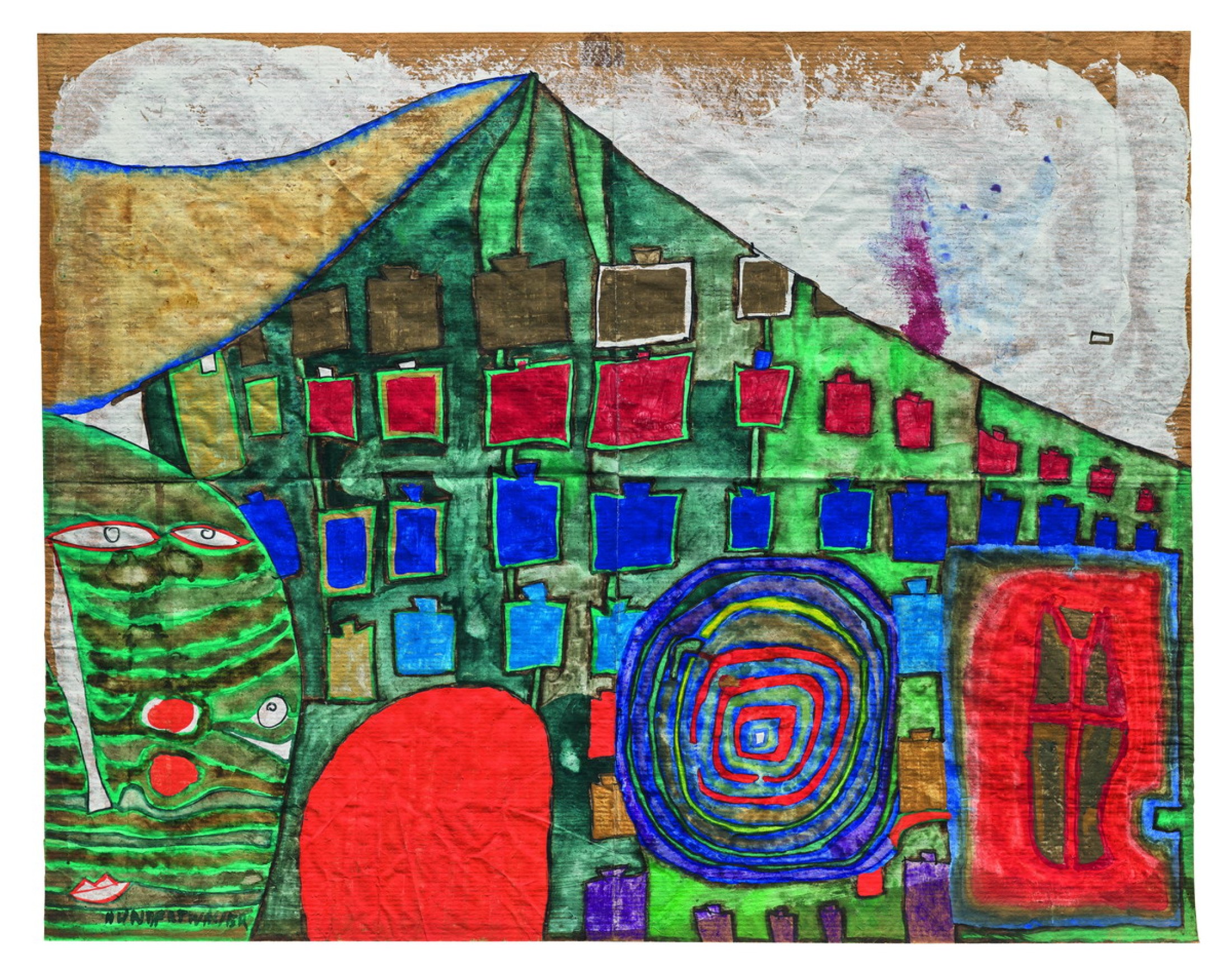 The house is, I suppose, my favourite motif. With me it is like with Egon Schiele, the painter I love so much, who so liked to paint houses. If I start a picture and don't know what to paint, I start either with a spiral or a house. Here I have added an innovation: windows resembling hot-water bottles. The Viennese windows from the sixties usually have a plaster crown above the window. that makes the windows look like hot-water bottles when they're painted. I was already interested in architecture back then; I would have liked it best if the houses were not all alike, but had different-sized windows instead - like African houses. What I can't build, I paint, naturally. In the process I try to have the windows not only of different sizes and at different levels, but also to give them different crowns. Of course it shouldn't look chaotic; there should be real storeys and windows situated above or below one another. But the whole should be humane, in a word. - Green is my favourite colour. Why shouldn't a house be green? If the forest were slowly to disappear because the cities are getting bigger, then at least the houses would be green. I can well imagine green for a house - green ceramic tiles, for instance. Down below in the picture is a spiral as a cloud. Clouds are spirals to me. Anything can be a spiral: eyeglasses, clouds - everything can occur in spiral form. I think the house here is on fire. But I'm not quite sure. I like it when houses are on fire. (from: Hundertwasser, Buchheim Verlag, Feldafing, 1964 and ed. 1973, p. 26)