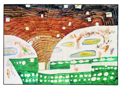 Hundertwasser malte, wo auch immer er sich aufhielt: zu Hause, in der Natur und unterwegs, in Kaffeehäusern und Restaurants, im Zug oder im Flugzeug, in Hotels oder bei Freunden und Bekannten, wo er zu Gast war.Er hatte kein Atelier und malte auch nicht an der Staffelei, sondern er legte die Leinwand oder das Papier flach vor sich aus. War er unterwegs, konnte es sein, dass er die Arbeit faltete und jeweils nur den sichtbaren Teil des Werkes überblickend malte.
