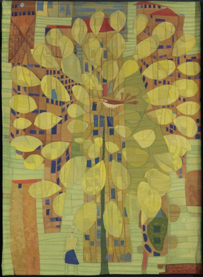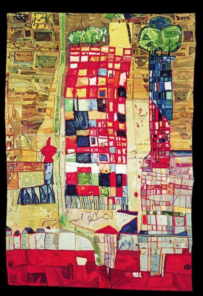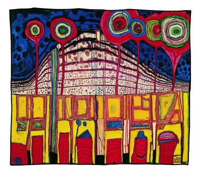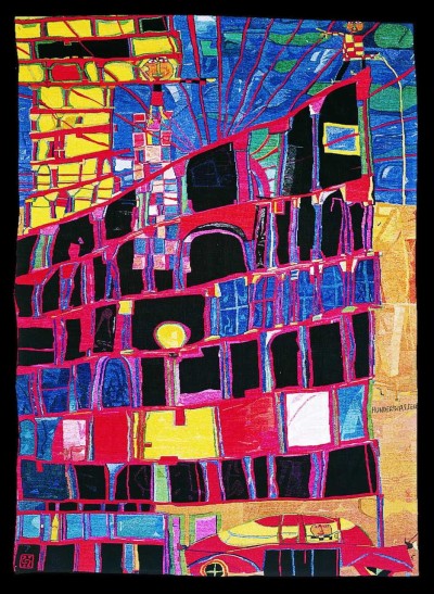 Hundertwassers erste Tapisserie 133 Pissender Knabe mit Wolkenkratzer entstand 1952 aufgrund einer Wette mit des Textilkünstlern Fritz Riedl und Johanna Schidlo. Hundertwasser stellte seine Behauptung unter Beweis, man könne eine Tapisserie ohne Karton, ohne eine Vorlage in der Originalgröße weben. Auch sämtliche nachfolgende Tapisserien entstanden ohne Karton, sie wurden jedoch von Webern hergestellt, die Hundertwasser auswählte.