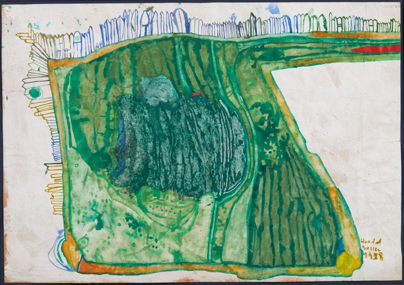 Immer wieder Gärten mit Zäunen herum (siehe auch 118). Vielleicht waren es die unerreichbaren Schrebergärten meiner Jugend auf der Schmelz, die beschützte Natur, der "Natur-Freikauf", den ich später praktizierte. (aus: Hundertwasser 1928-2000, Catalogue Raisonné, Bd. 2, Taschen, Köln 2002, S. 355)