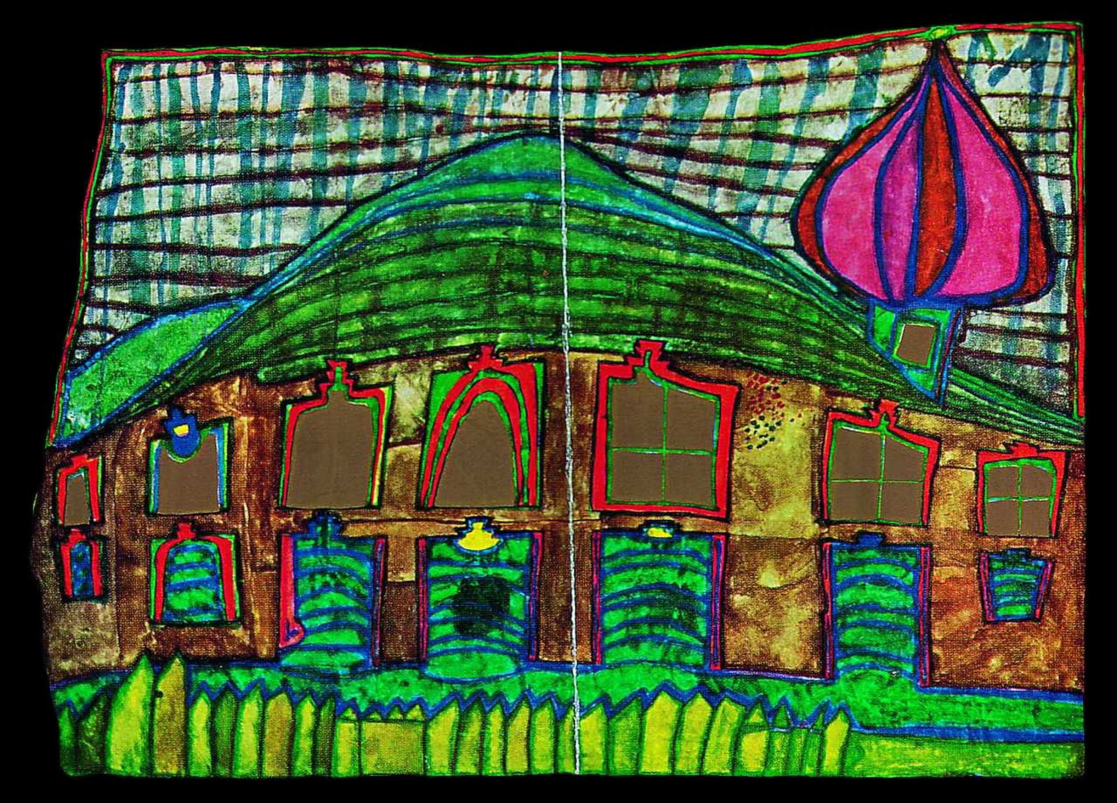 Ich habe hier ein architektonisches Problem behandelt und auch ein mystisches. Ich habe die Zwiebel sehr gern. Man hat mir gesagt, daß in vielen Ländern die Zwiebel als Gottheit verehrt wird. Sie gilt als Symbol der Fruchtbarkeit. Deswegen hat man Zwiebeltürme gebaut. Zur Architektur selbst: Ich bin für eine Architektur, die nicht gerade ist. Und ich kann mir sehr gut eine Kirche vorstellen, die gleichzeitig ein Berg ist. Merkwürdig: Ein buckliger Mensch wird als häßlich empfunden und einer, der keinen Buckel hat, als schön. Eine Kirche, die keinen Buckel hat, soll schön sein und eine Kirche, die einen Buckel hat, soll häßlich sein. - Da habe ich eben eine bucklige Kirche gezeichnet, die besonders liebesbedürftig ist - ich habe sie mit Goldfenstern besetzt. Das Bild ist auf einer Reise entstanden. Das Papier ist außen unregelmäßig. Ich habe sehr gern unregelmäßige Papiere und male den Rand oft äußerst liebevoll, und zum Zeichen, daß mir an dem unregelmäßigen Rand besonders liegt, rändere ich ihn noch besonders kostbar ein, so wie man mit Brokat einsäumt. Also mit Absicht, denn ich habe furchtbare Sachen erlebt: Man hat mir oft die unregelmäßigen Aquarelle zu Rechtecken zugeschnitten - und nicht nur das - man hat sie auch noch aufgeklebt auf Holz und Leinwand - und nicht nur das - man hat sie auch noch gefirnißt, um sie als Ölbilder verkaufen zu können. In Italien und in anderen romanischen Ländern ist das leider eine ganz schreckliche Krankheit, daß man Aquarelle nicht für vollwertig empfindet, sondern nur Ölbilder. Wenn man ein Aquarell hat, muß man es unbedingt in ein Ölbild verwandeln. Ich glaube, die Italiener haben das auch mit Klee gemacht. Das ist ganz entsetzlich. Ein fruchtbarer Vandalismus! Seltsam, daß gerade bei den Deutschen und Engländern das Aquarell so gehütet und geachtet ist und eben dort nicht. (aus: Hundertwasser, Buchheim Verlag, Feldafing 1964 und Ausg. 1973, S. 12)